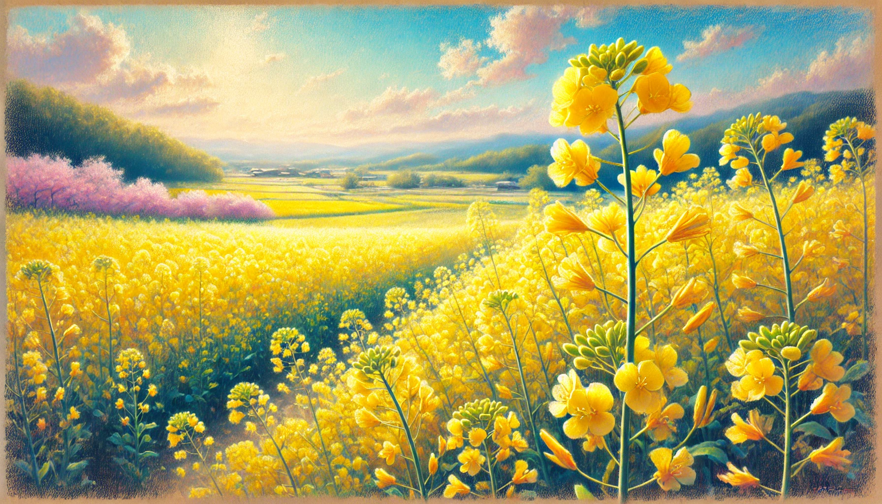 → 菜の花と子どもの笑顔が重なる明るい朝を表現。