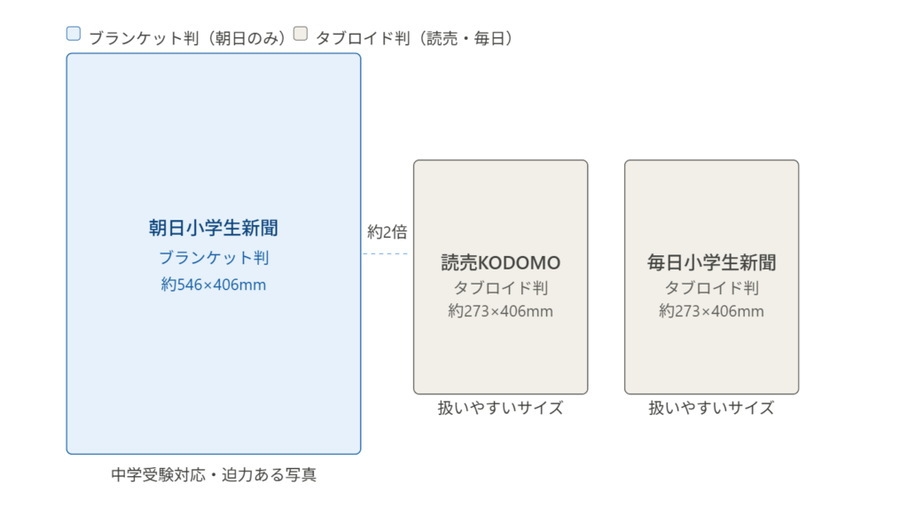 朝日小学生新聞は唯一の大きな紙面(ブランケット判)で、