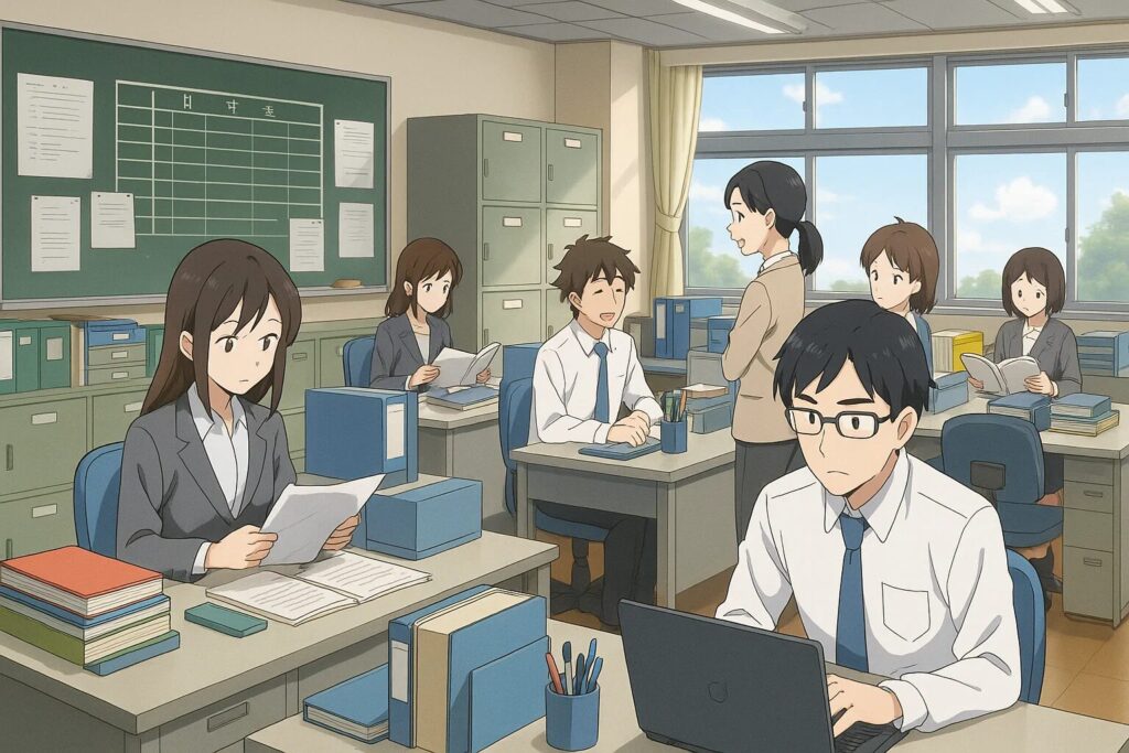 「雑然とした職員室の机」は、それ自体が「未完了のタスク」のように見え、