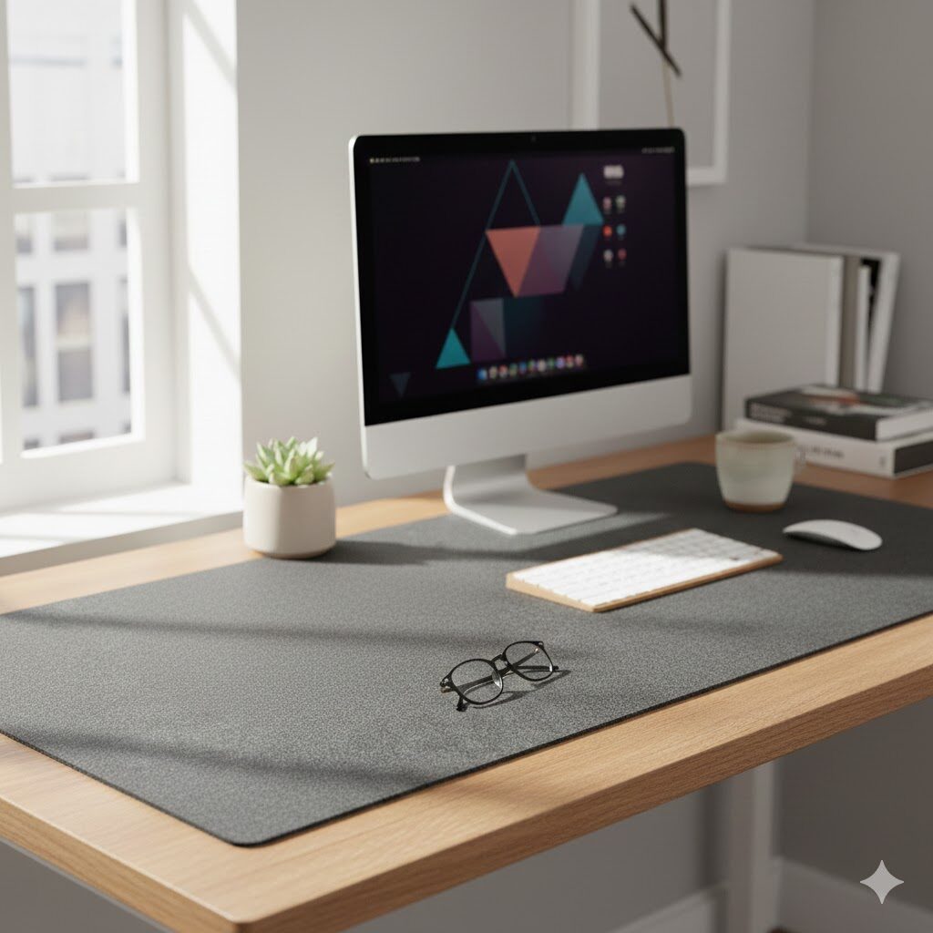 - デスクマットの威力: 色や素材を吟味したマットで、机の上が一気に垢抜ける。