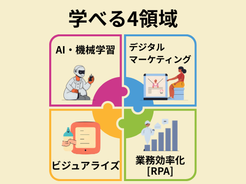 学べる4領域(AI・機械学習/デジタルマーケティング/ビジュアライズ/業務効率化[RPA])